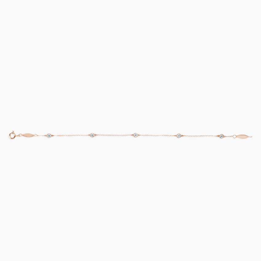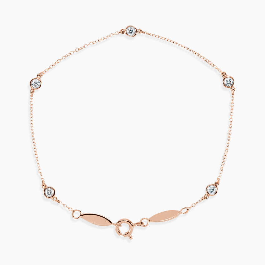 This bracelet, which combines elegance and timelessness, has five brilliant natural diamonds that are bezel-set on a fine 14k Rose Gold cable chain. A spring ring clasp holds this bracelet with diamond chain links in place.