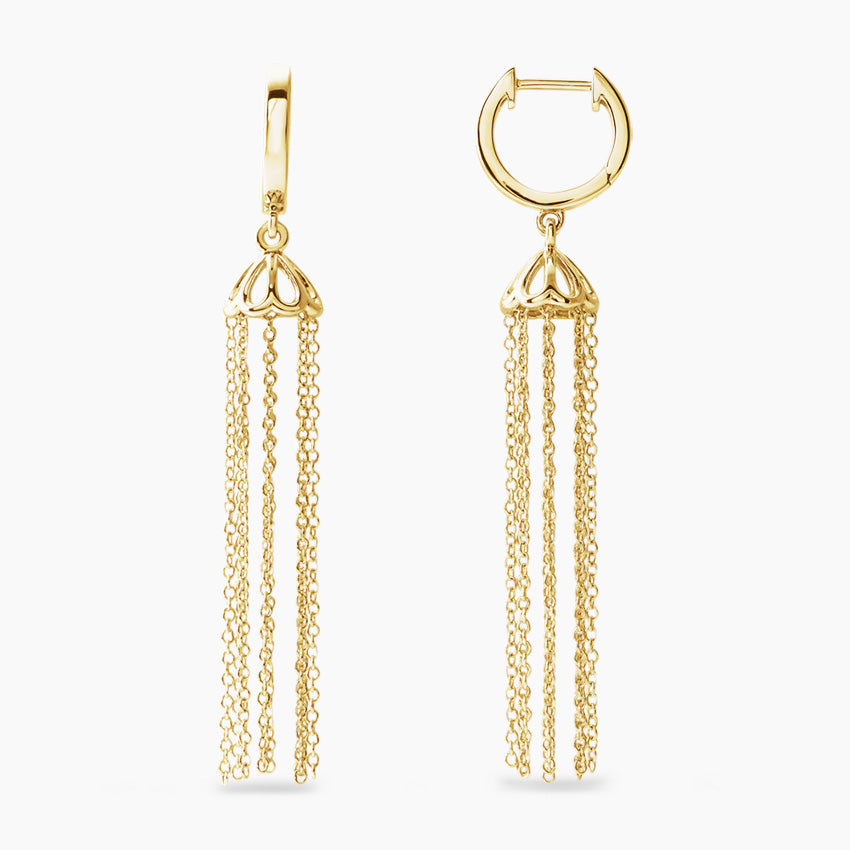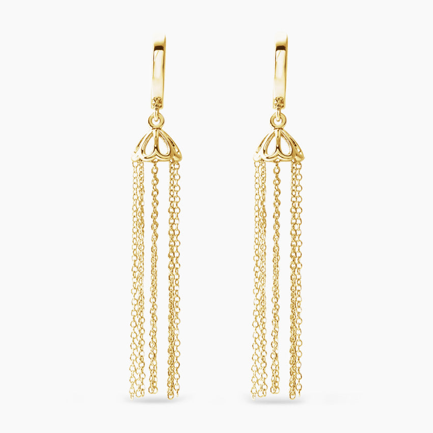 These lovely earrings are the ideal finishing touch for any ensemble and are appropriate for any occasion. These hoops are carefully carved with 14k Yellow Gold, and a few gold chains are suspended beneath each hoop earring. These earrings have a simple style that adds to their appearance of elegance and sophistication.