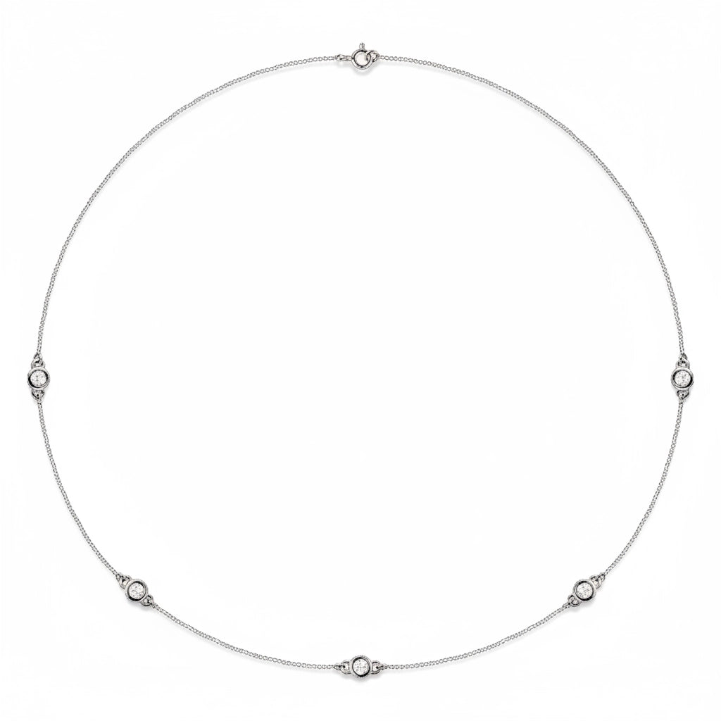 The ultimate layering piece. Five brilliant diamonds are bezel-set at intervals along a delicate 14K gold chain. The result is a look that feels like diamonds are floating on your skin. Wear it alone for a whisper of luxury, or stack it with a pendant for drama.