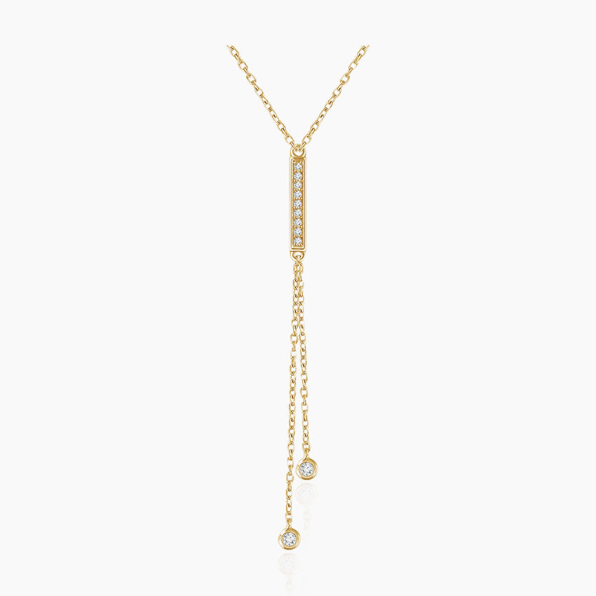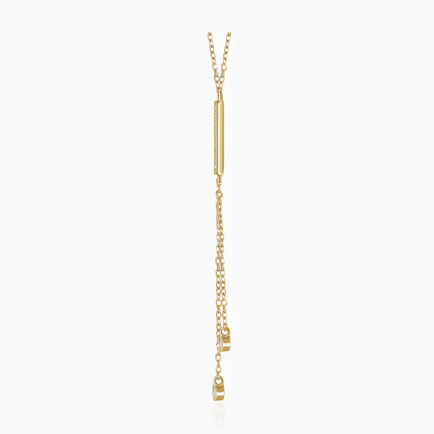 This diamond necklace exudes a subtle elegance and has two gold chain extensions with diamonds hung on a bar-shaped bale that was expertly created from 14k Yellow Gold. The two bars are connected by a cable chain in a distinctive drop shape. The bar has diamond accents for an opulent appearance.