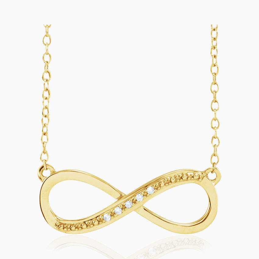 With 14k Yellow Gold and five of our finest sparkling diamonds, this fashionable necklace has a polished, traditional infinity symbol design. With its single infinity design, which offers an assurance of eternity and hope, it makes a distinctive statement. It guarantees dazzling relationships, much like its look. A subdued dash of glitz for both stunning evening ensembles and everyday attire.