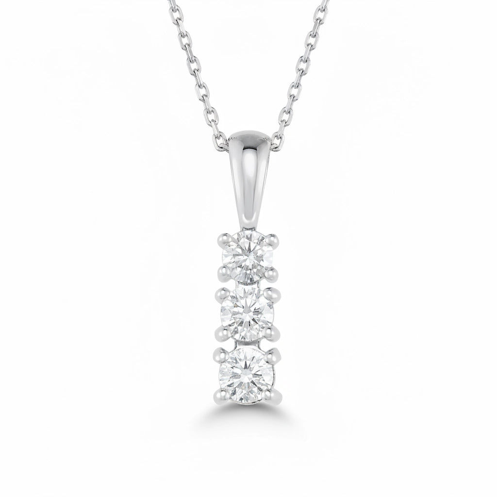 Three brilliant diamonds cascade down in graduating sizes, representing the journey of your life or love. This vertical "Journey" style elongates the neck and adds elegant movement to any neckline. A meaningful gift for anniversaries.