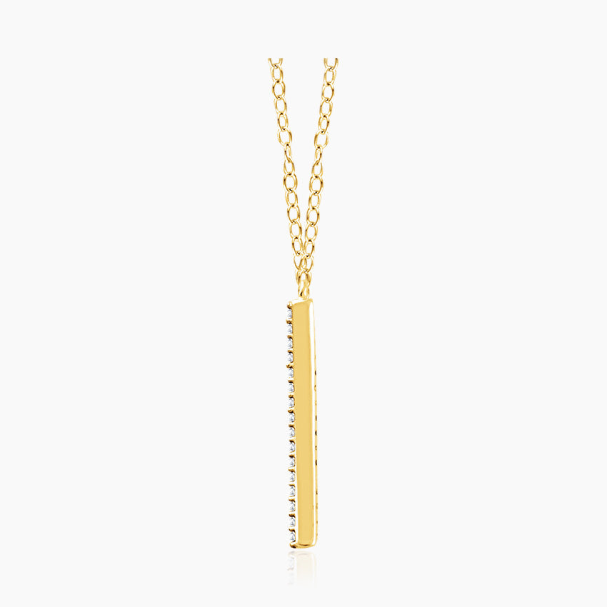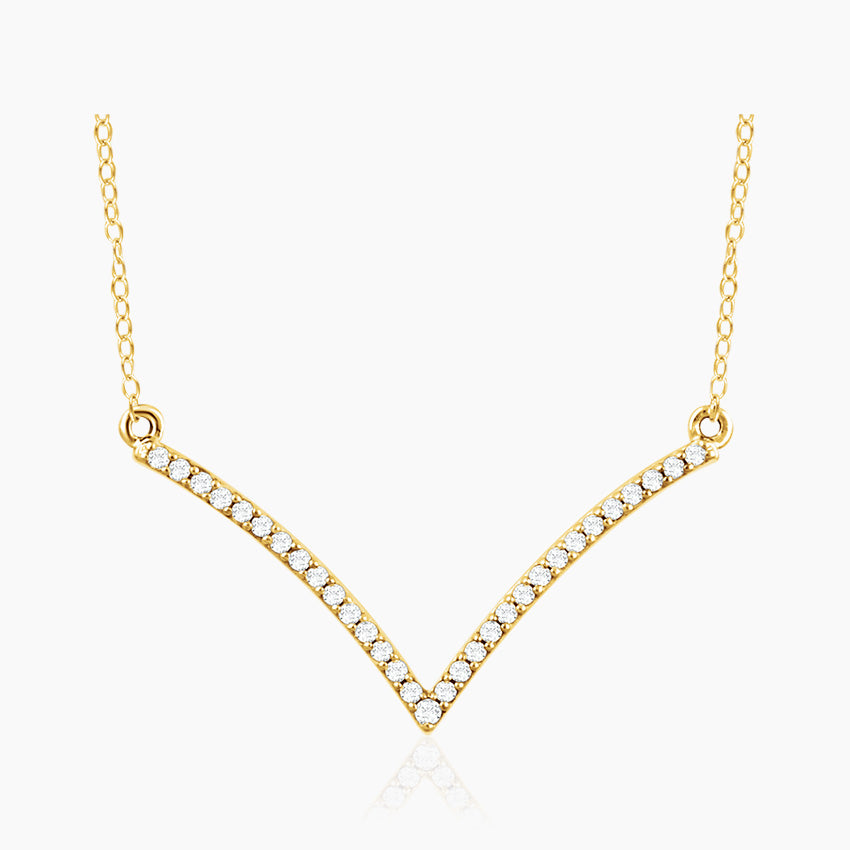 This pendant, which was expertly made by our talented jewelry artisans, features a striking V-shaped pattern that is guaranteed to attract everyone's attention. This elegant V pendant necklace is made from traditional 14k Yellow Gold. Add this pendant necklace to your collection of stunning, one-of-a-kind jewellery. The form is embellished with more than 30 real diamonds that are prong set.